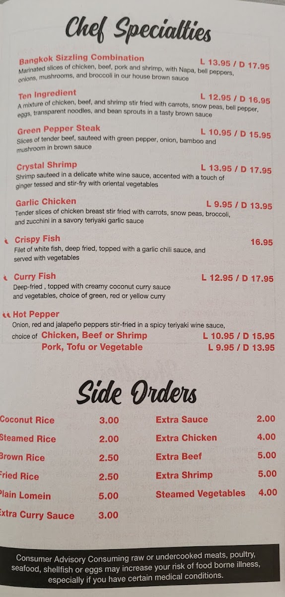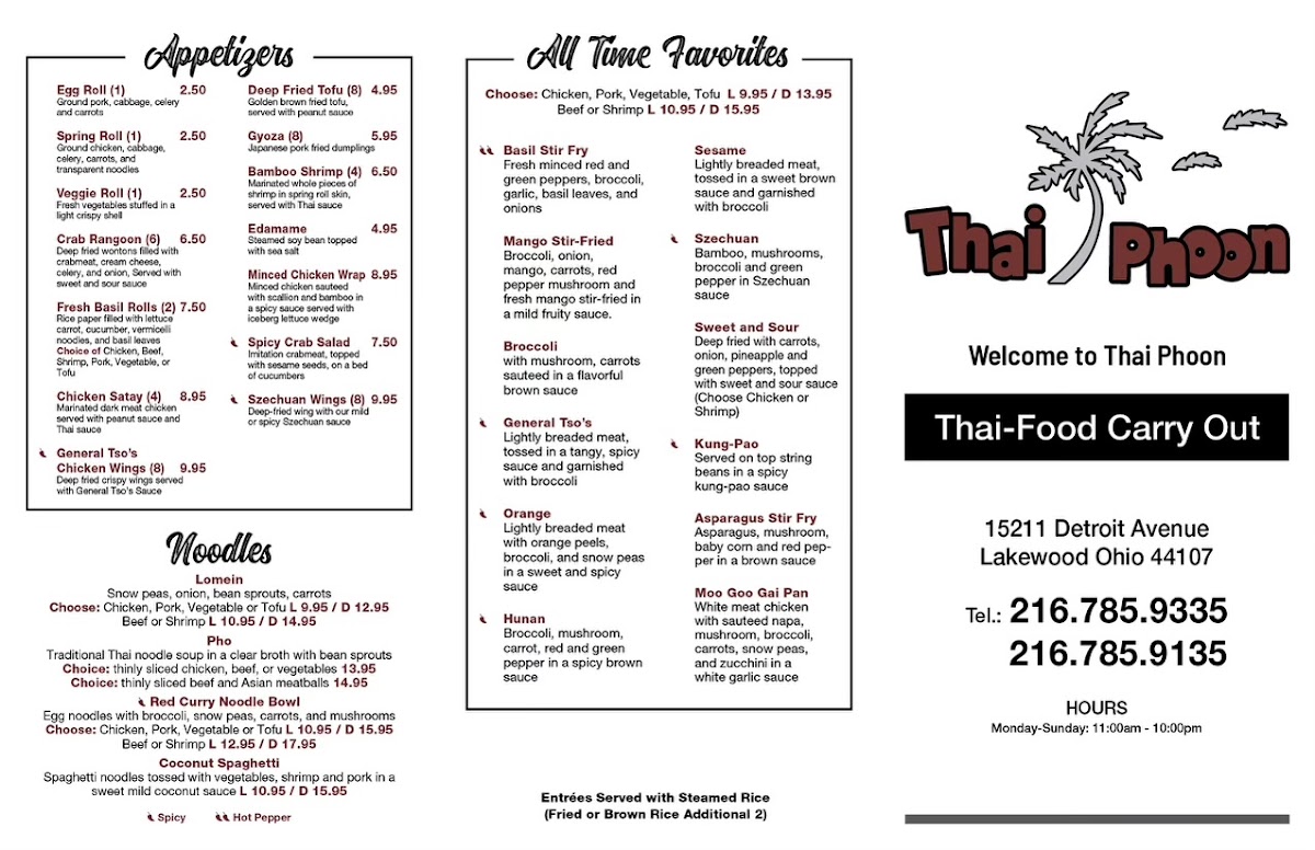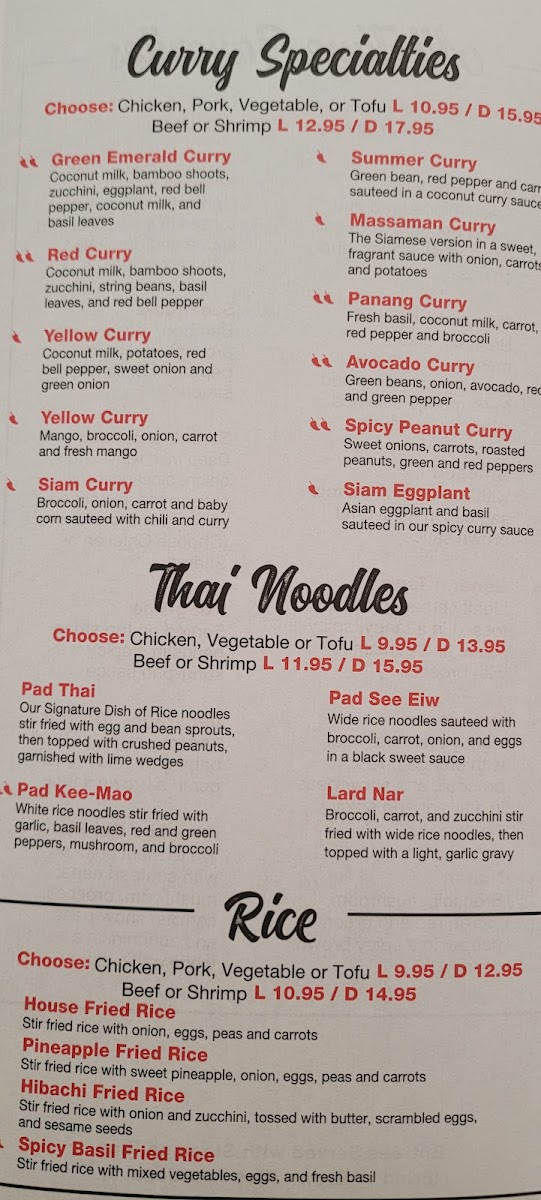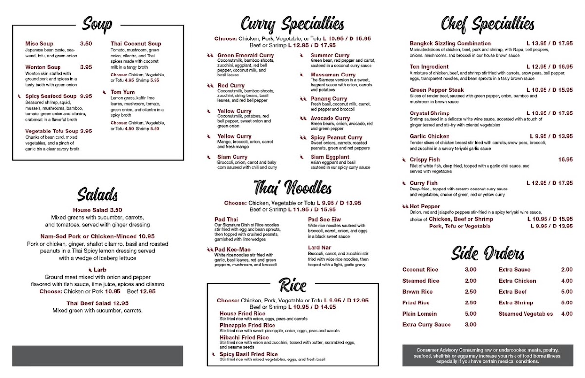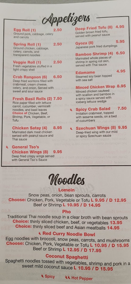 The menu at Thai Phoon Restaurant offers a delightful array of authentic Thai dishes with something for everyone. Start your meal with flavorful appetizers like the Spicy Crab Salad or Szechuan Wings (8), or perhaps try the Minced Chicken Wrap for a savory bite. If you're in the mood for a soup, options like Wonton Soup, Spicy Seafood Soup, and Tom Yum are perfect to warm you up. For lunch, the Red Curry Noodle Bowl and Pho are popular picks, while dinner brings more indulgent choices such as Pad See Eiw and Pad Thai. The restaurant’s curry specialties stand out, with the Yellow Curry Coconut Milk and Avocado Curry being highly recommended. If you're craving rice, you can opt for hearty dishes like Pineapple Fried Rice or Spicy Basil Fried Rice. The Chef Specialties section offers enticing options like Crystal Shrimp and the Bangkok Sizzling Combination for a more elevated dining experience. With flavorful salads like Thai Beef Salad and Nam-Sod Pork, as well as a variety of noodle dishes, Thai Phoon’s menu is a perfect blend of traditional and innovative Thai cuisine.