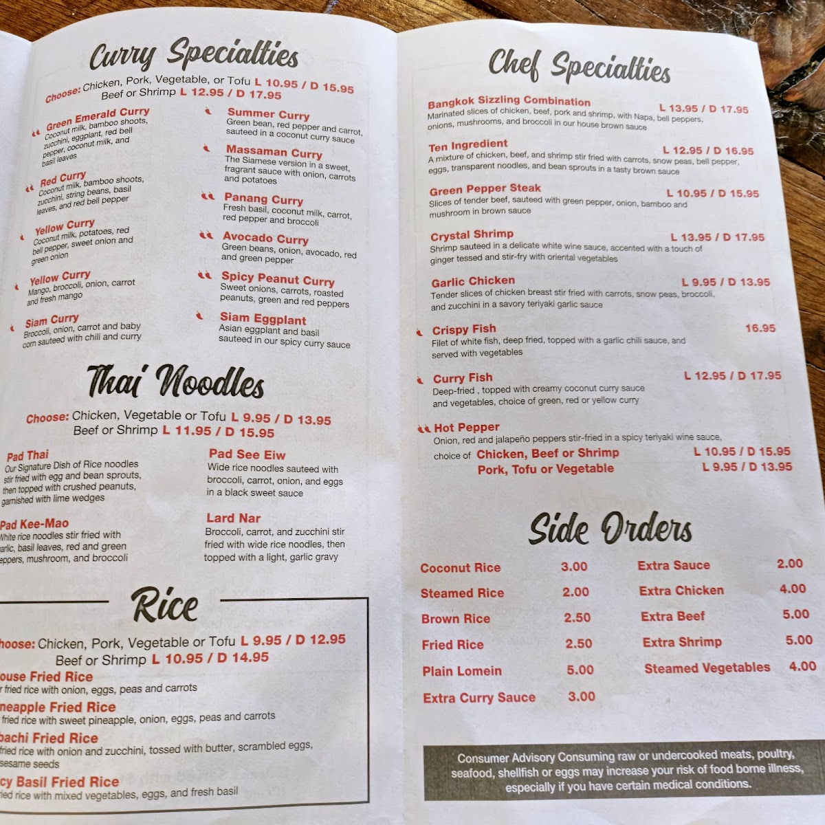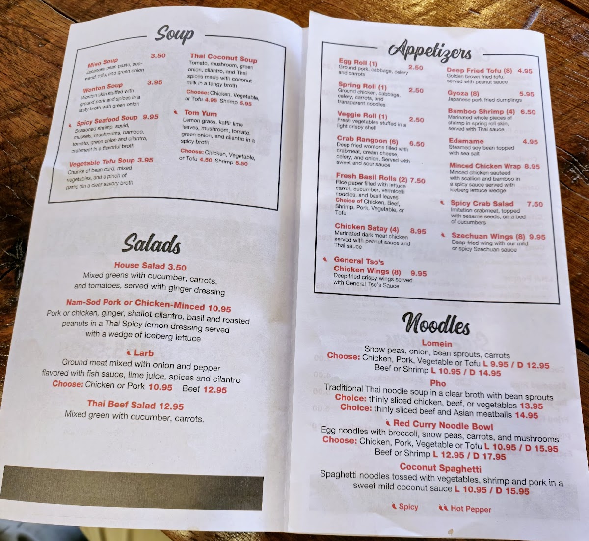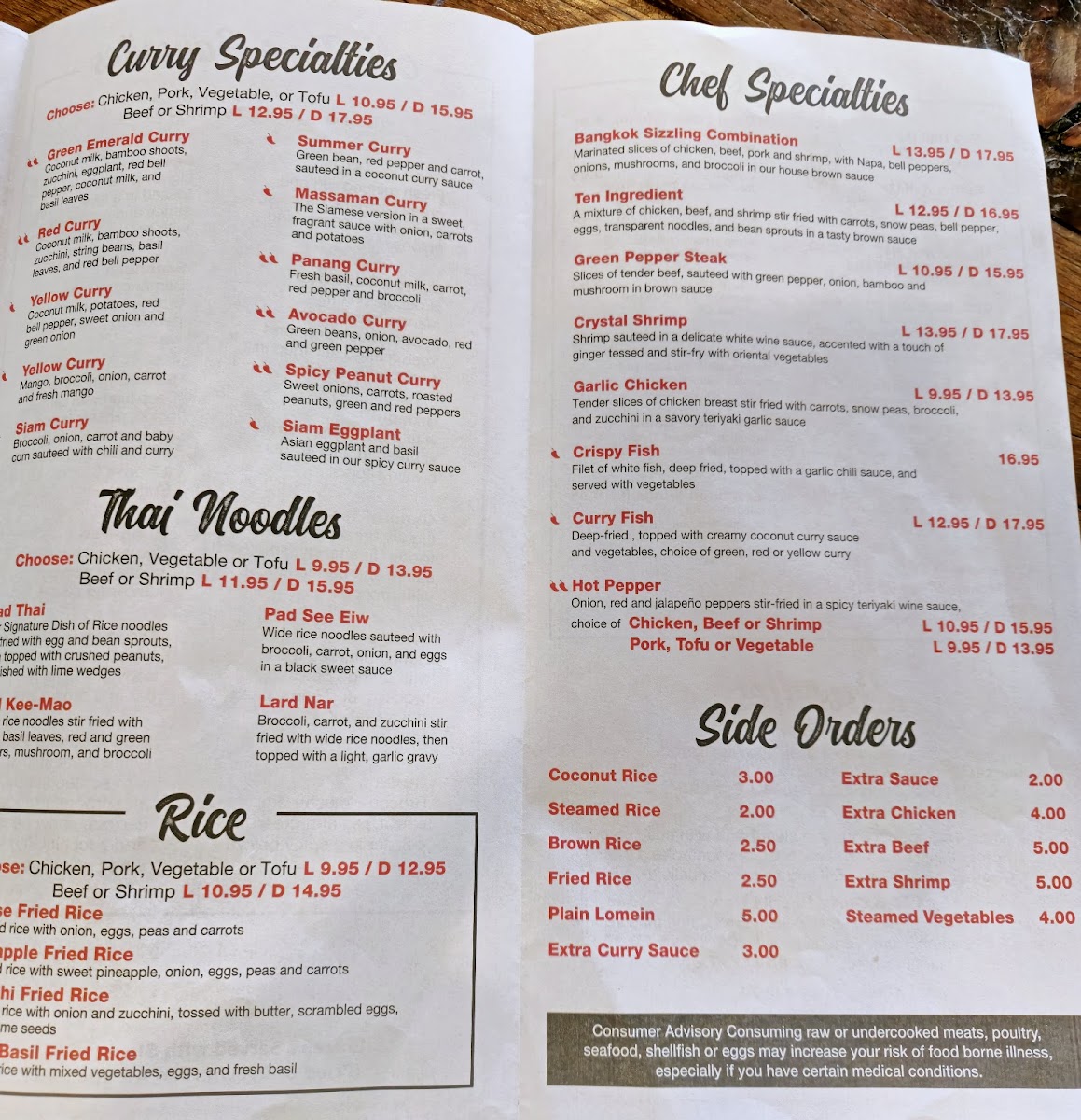 The menu at Thai Phoon Restaurant offers a delightful array of authentic Thai dishes with something for everyone. Start your meal with flavorful appetizers like the Spicy Crab Salad or Szechuan Wings (8), or perhaps try the Minced Chicken Wrap for a savory bite. If you're in the mood for a soup, options like Wonton Soup, Spicy Seafood Soup, and Tom Yum are perfect to warm you up. For lunch, the Red Curry Noodle Bowl and Pho are popular picks, while dinner brings more indulgent choices such as Pad See Eiw and Pad Thai. The restaurant’s curry specialties stand out, with the Yellow Curry Coconut Milk and Avocado Curry being highly recommended. If you're craving rice, you can opt for hearty dishes like Pineapple Fried Rice or Spicy Basil Fried Rice. The Chef Specialties section offers enticing options like Crystal Shrimp and the Bangkok Sizzling Combination for a more elevated dining experience. With flavorful salads like Thai Beef Salad and Nam-Sod Pork, as well as a variety of noodle dishes, Thai Phoon’s menu is a perfect blend of traditional and innovative Thai cuisine.