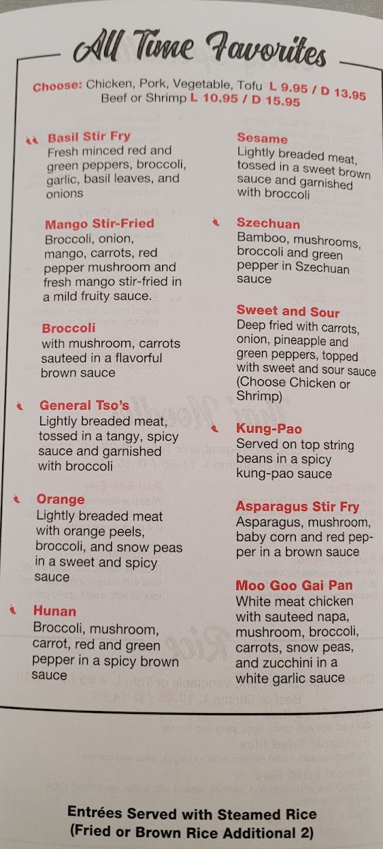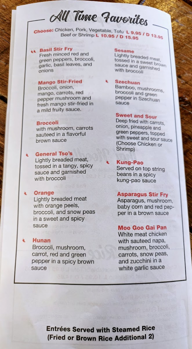 Hot pepper. Onion, red and jalapeño peppers stir-fried in a spicy teriyaki wine sauce, choice of chicken, beef, shrimp, pork, tofu or vegetable.